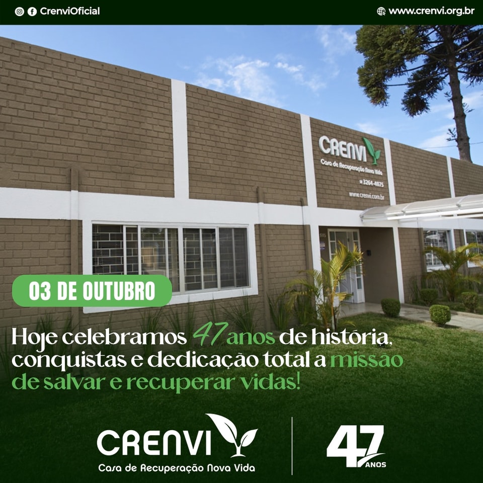 Hoje, 03 de Outubro de 2024, a CRENVI - Casa de Recuperação Nova Vida comemora 47 anos de história.